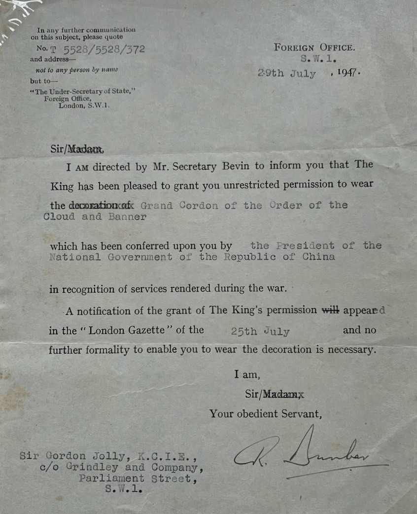 British Permissions to Wear Warrant for the Chinese Republican Orders