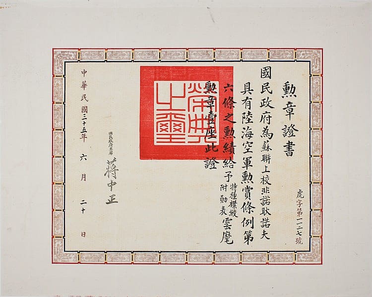 5th class Order of the Cloud and Banner No.285 awarded in 1942 "Flying Tigers" Ace Charles H. Older