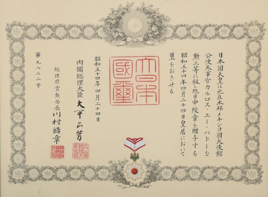3rd class Rising Sun order awarded in 1979 to Mexican Diplomat Carlos Antonio Bado López