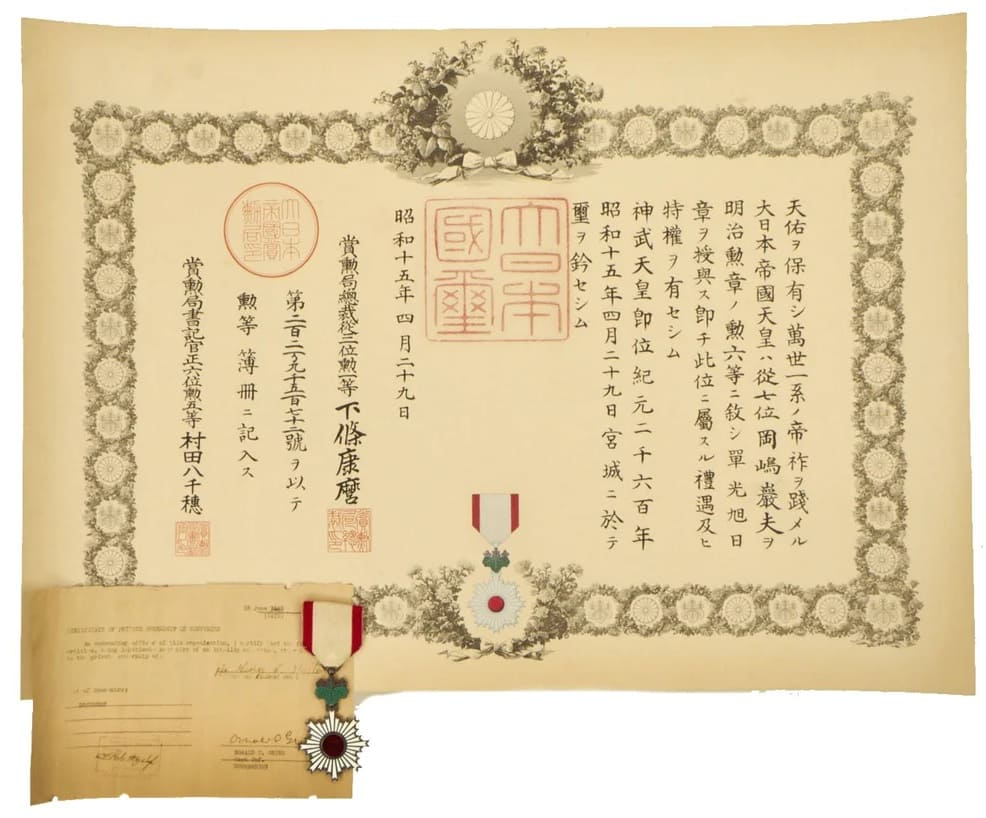 2nd class Rising Sun order awarded in 1957 and 2nd class Sacred Treasure order awarded in 1941
