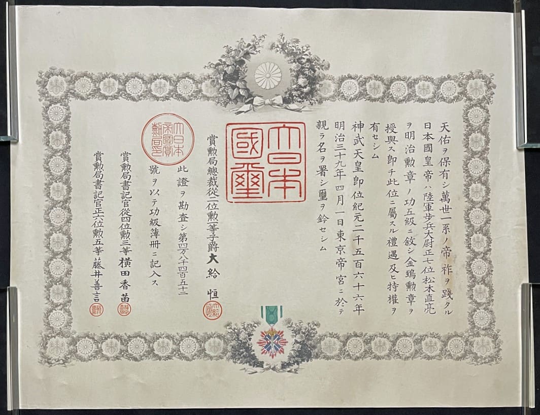 5th class Golden Kite order awarded on April 1, 1906 to Captain Naosuke Matsuki.