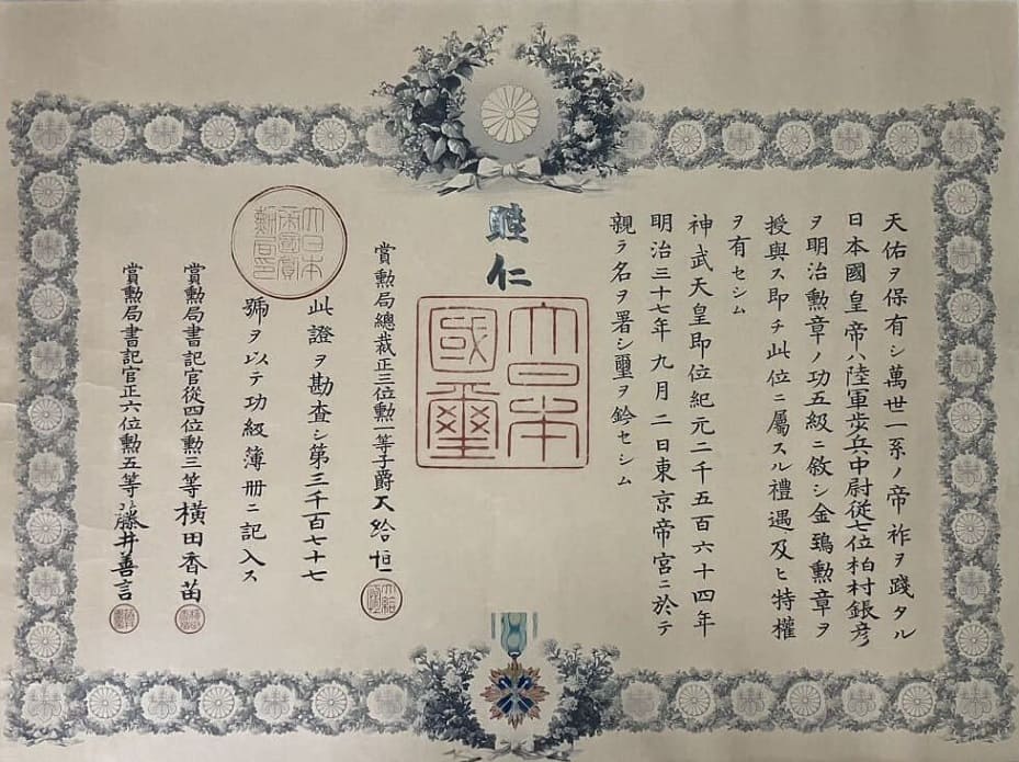 3rd class rising sun order document issued in 1906