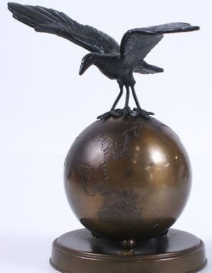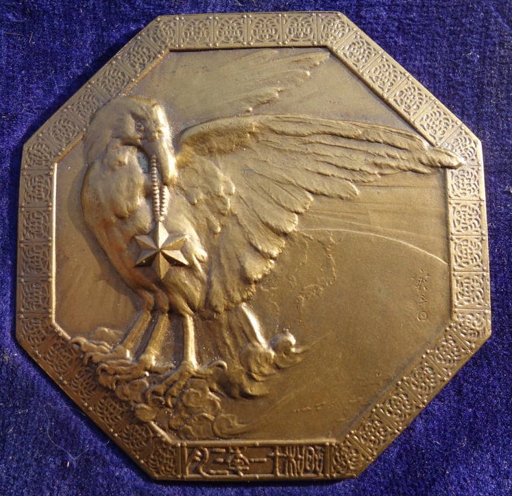 Yatagarasu (later emblem of Imperial Soldier Relief League) standing on the earth looking over Asia. On the base is a six pointed star (another emblem of...