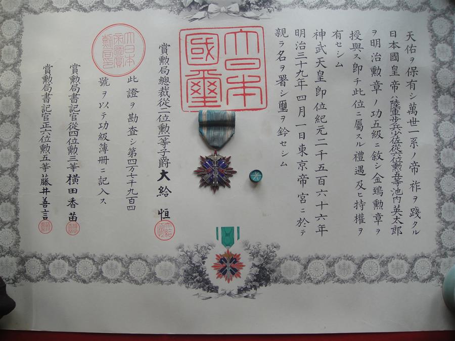 Awarded on April 1, 1906 to Infantry Major /歩兵少佐/ Eitaro Ikeuchi /i池内英太郎/.
