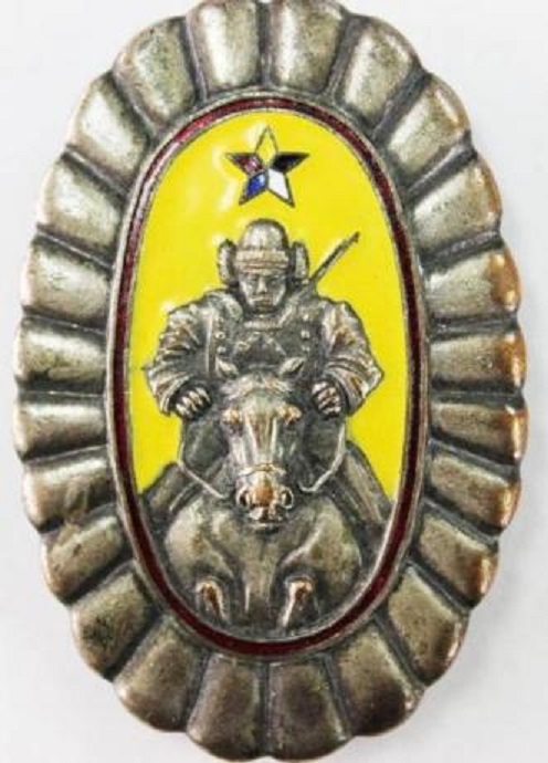 According to the Okorokov this badge was approved in 1944. The badge is a silver-colored coat of arms shield; in the central part of the shield, diagonally, there are three ribbons of Russian national colors (white-blue-red). At the bottom of the shield placed a kanji for the area/city, The...