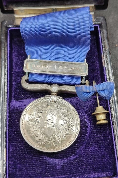 Set that was awarded on November 14, 1955. Note highly unusual case (look like they used case for 7th/8th class Rising Sun order. Typical cases for a medals from 1940s/1950s https://asiamedals.info/threads/blue-ribbon-medal-of-honor-awarded-in-1944.27269/ ...