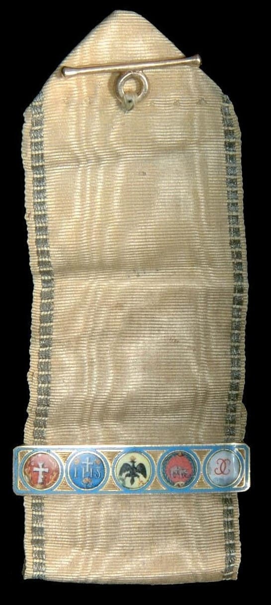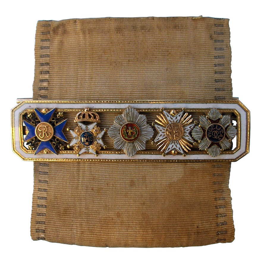 Golden bar with enameled medallions of five orders fitted as a clasp on Order of Fidelity riband. Baden, House Order of Fidelity; Denmark, Order of the Elephant, with elephant as on badge; Prussia, Order of the Black Eagle; Sweden, Order of the Seraphim; Denmark, Order of the Elephant, with...
