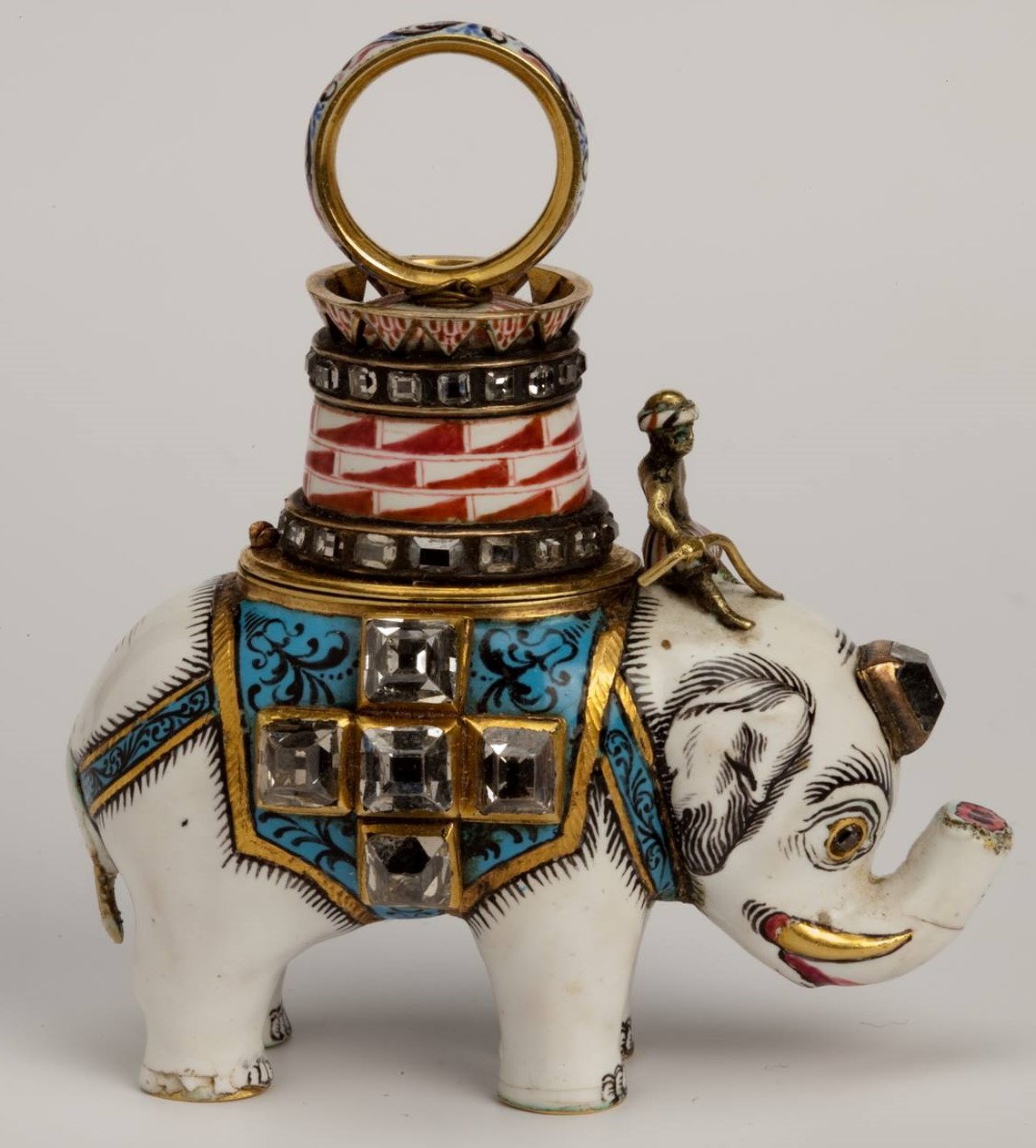 Gold, enamel, diamonds, rubies.