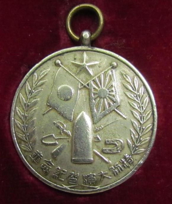 Badge with identical design and inscriptions but issued by Kagoshima Prefecture https://asiamedals.info/threads/1935-army-special-large-maneuvers-kagoshima-prefecture-imperial-visit-security-guard-commemorative-badge.25932/