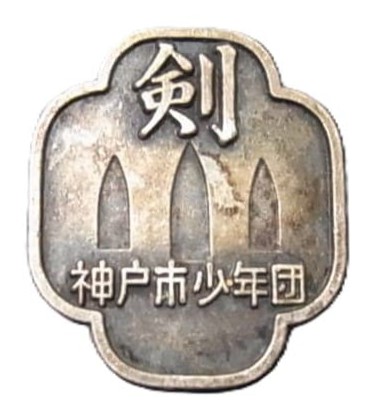 Tsuba-shaped badge. Size 18 × 21 mm. Obverse 剣 for 剣道 - Kendo 神戸市少年團 - Kobe City Youth League