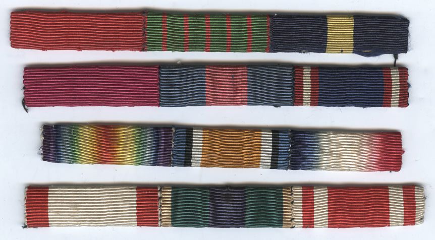 Ribbon bar, on buckram, in four strips, bearing the ribbons: Order of the Bath; Order of St. Michael & St. George; Royal Victorian Order; 1914-15 Star; British War Medal 1914-20; Victory Medal 1914-19; France, Legion of Honour; France, Croix de Guerre 1914-18; U.S.A., Distinguished Service Medal...