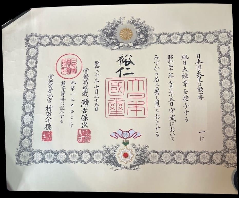 1st class risingsunorder document issued in 1945