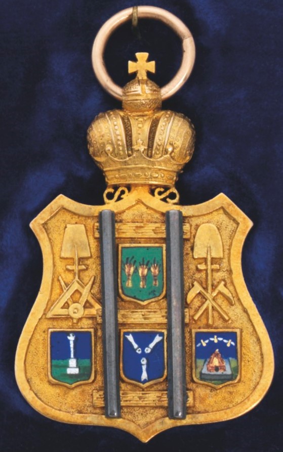 Obverse decorated with the enamelled coats of arms of Russian Governorates of Penza, Tambov, Saratov and Simbirsk, the reverse inscribed in Russian "Morshansk-Syzran Railway open 1874"/"Моршанско-Сызранская жел. дор. открыта 1874" and engraved...