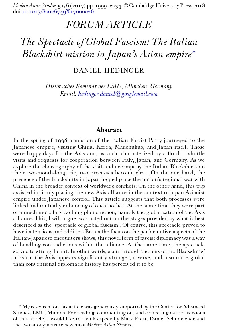 Interesting article The Spectacle of Global Fascism: The Italian Blackshirt mission to Japan's Asian empire by Daniel Hedinger.