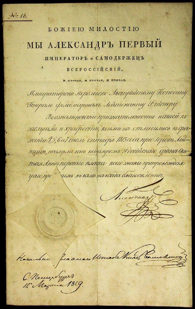 "To the Imperial Royal Austrian Sir General Field Marshal Lieutenant Reisner/Императорско Королевско Австрийскому Господину Генералъ Фельдмаршалъ Лейтенанту Рейснеру".