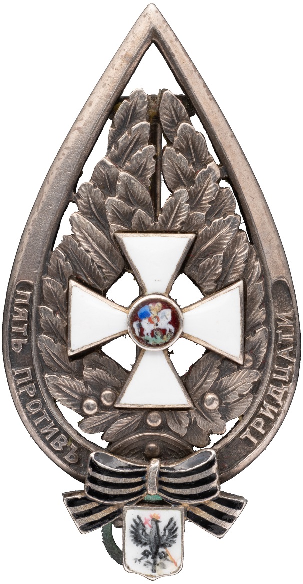 Badge of the 17th Hussar Chernihiv of His Imperial Majesty Grand Duke Mikhail Alexandrovich regiment was approved by Highest Order on May 2, 1912. A badge in the form of the pommel of the regimental St. George banner with the regiment's motto "Five Against Thirty". In the middle of the badge is...
