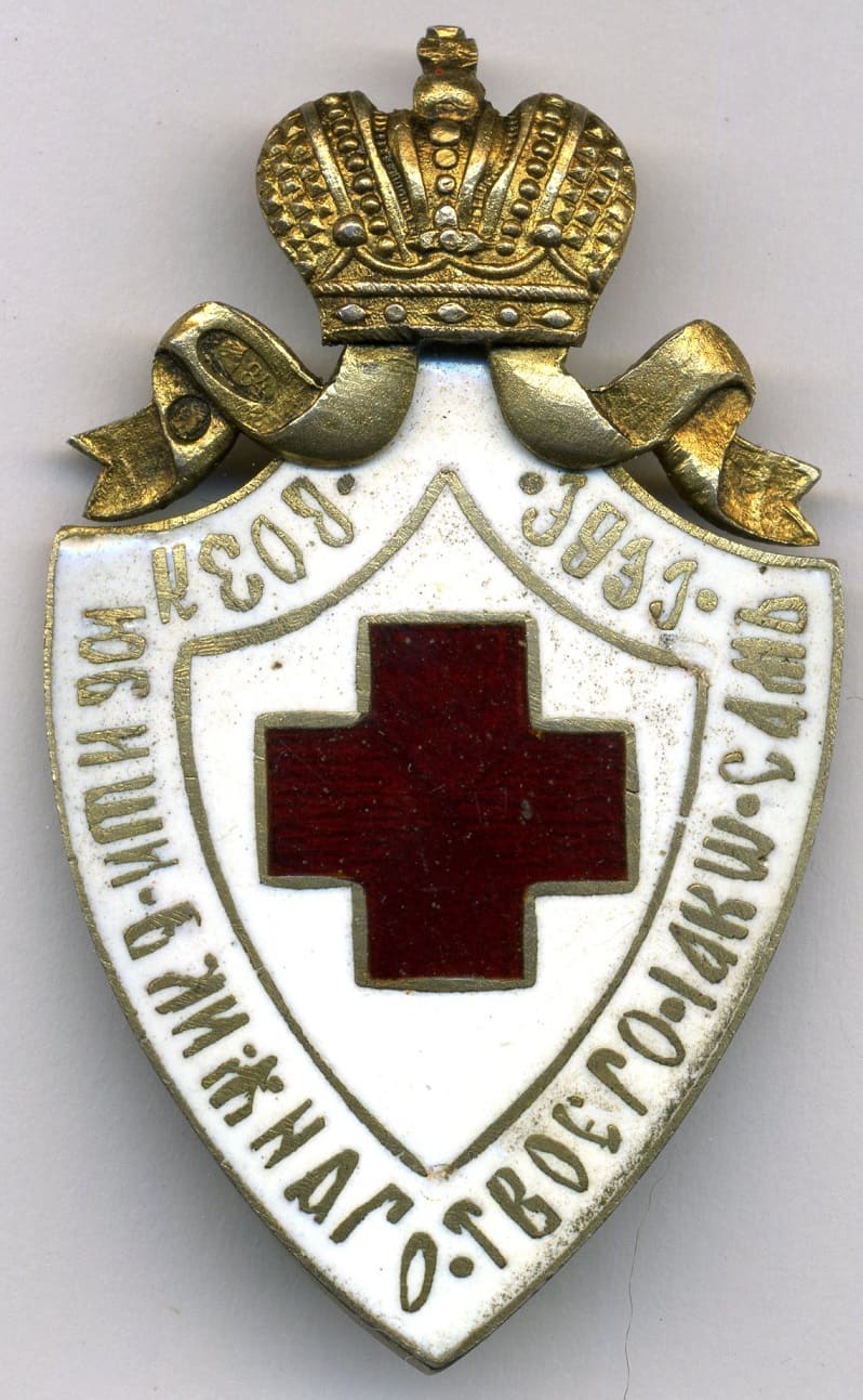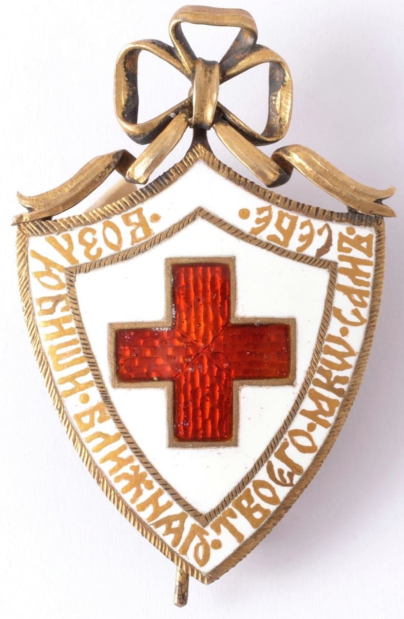 The badge was issued to members of the Russian Red Cross Society of both sexes for merits in the affairs of the Society during military operations and public disasters or for long-term useful activity in peacetime, as well as for a one-time donation of at least 5000 rubles. Worn on the left side...