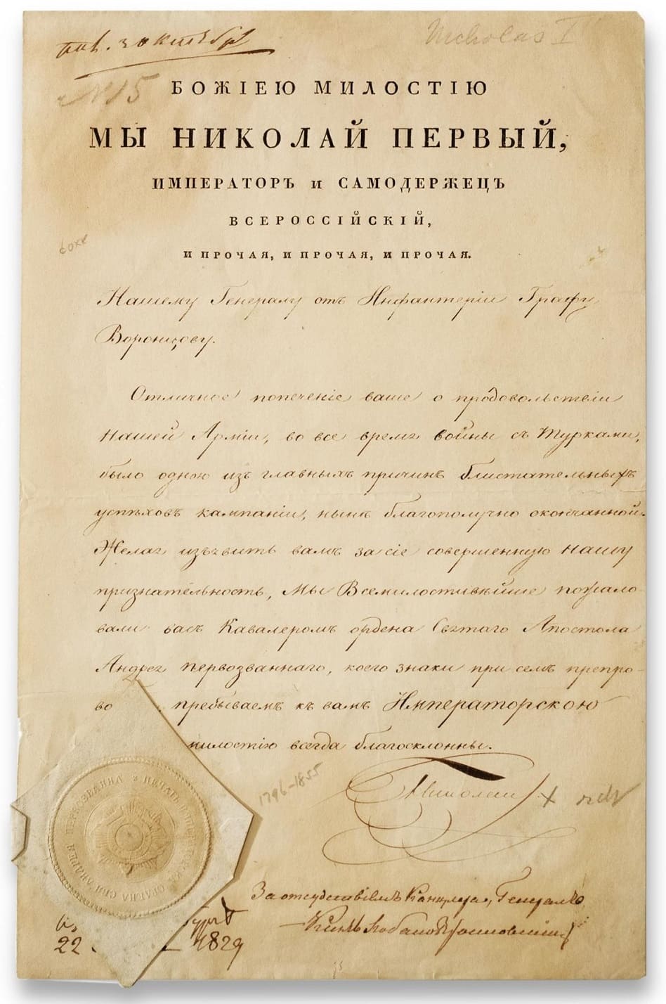 Rare document issued on September 22, 1829 to the Infantry General Mikhail Semyonovich Vorontsov for excellent care of the army’s food supply throughout the war with the Turks.