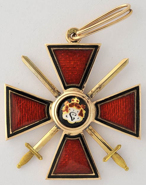Marked with "double-headed imperial eagle" and partly readable maker's mark "AK" for Albert Keibel on reverse beneath the enamel, ring marked with St. Petersburg assay office gold hallmark "56+anchors" from 1882-1899 time period. Cross was awarded to colonel...