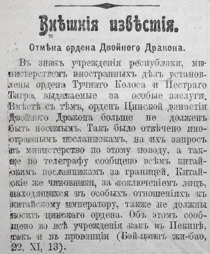 The statutes of the Order of of the Double Dragon, including full-size illustrations, were printed in Chinese and also in French by Th. Dupuy in Paris in form of a proposal of the Tsongli-Yamen (Premier's office) to the Empress Regent on February 7, 1882; they were imperially approved on the...
