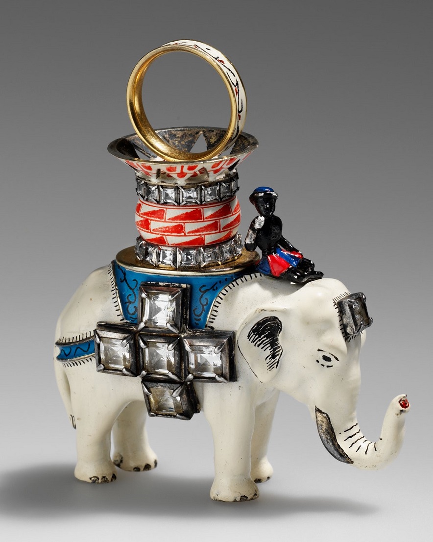 Gold, silver, table-cut stones, enamel.