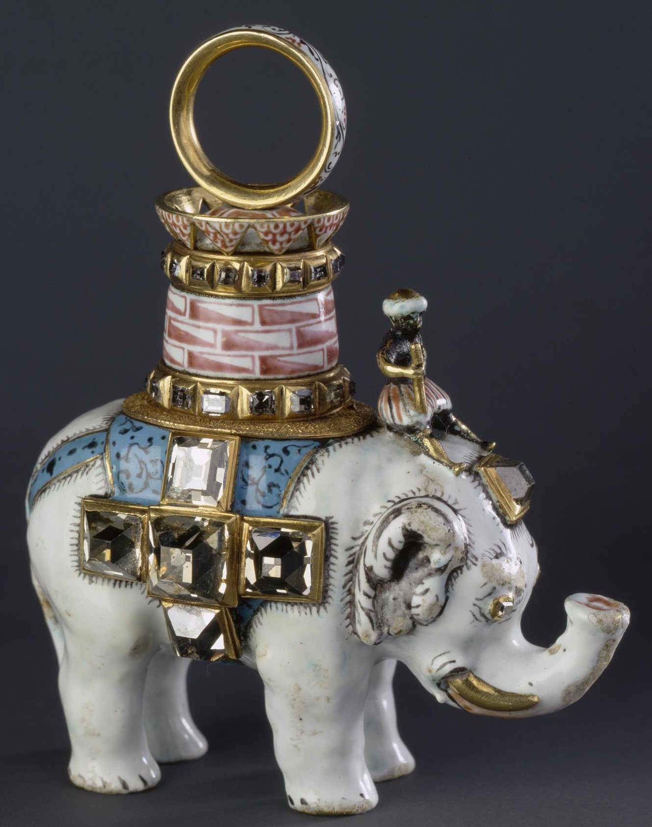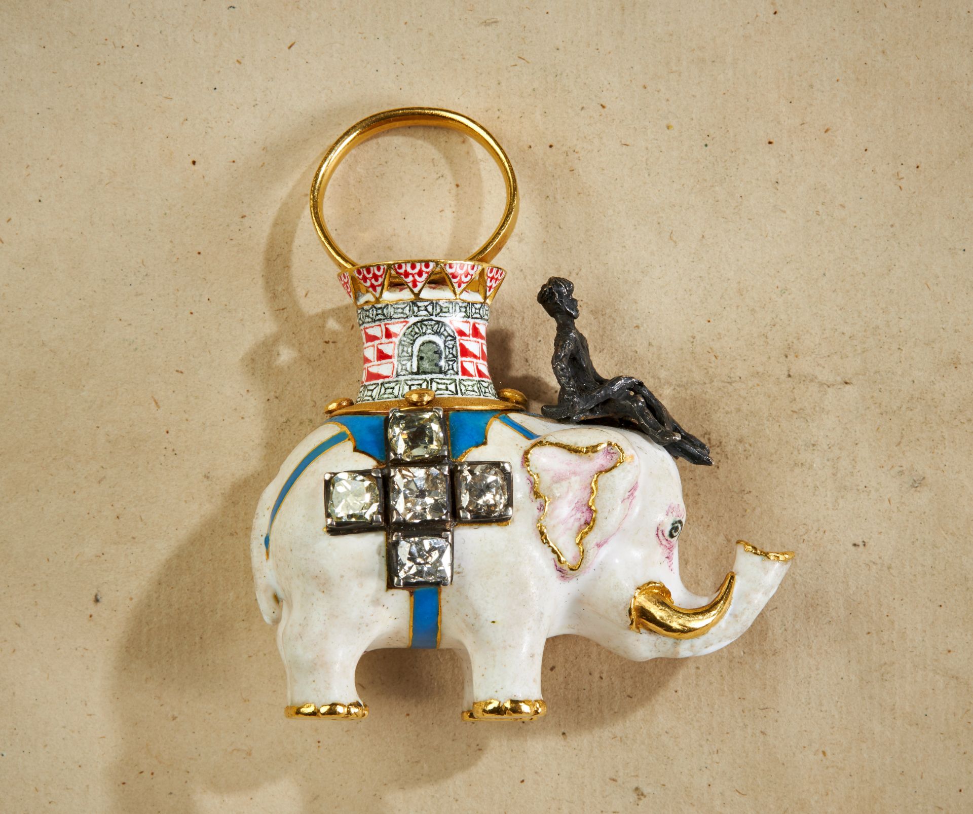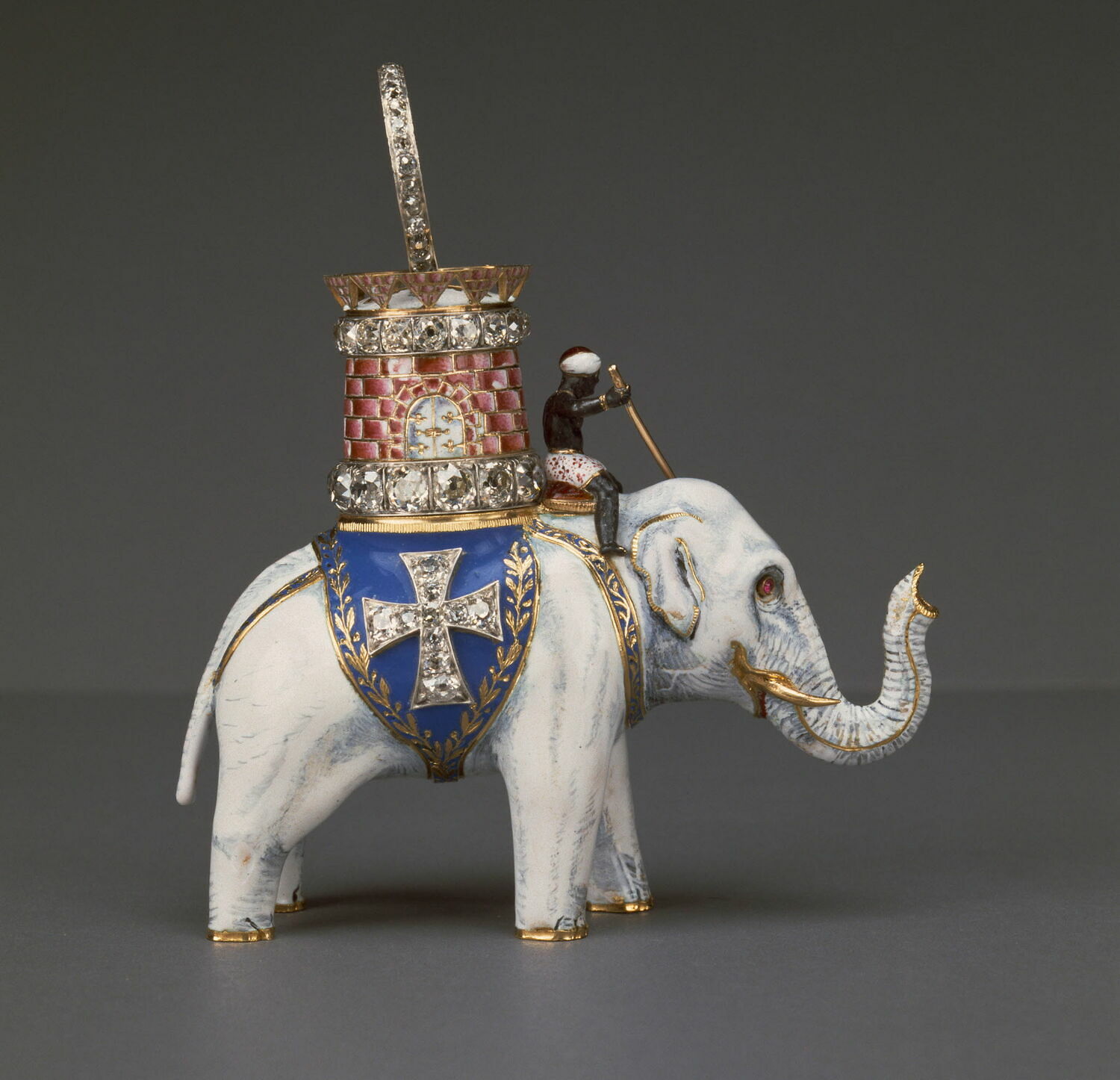 Gold, enamel, diamonds, rubies.
