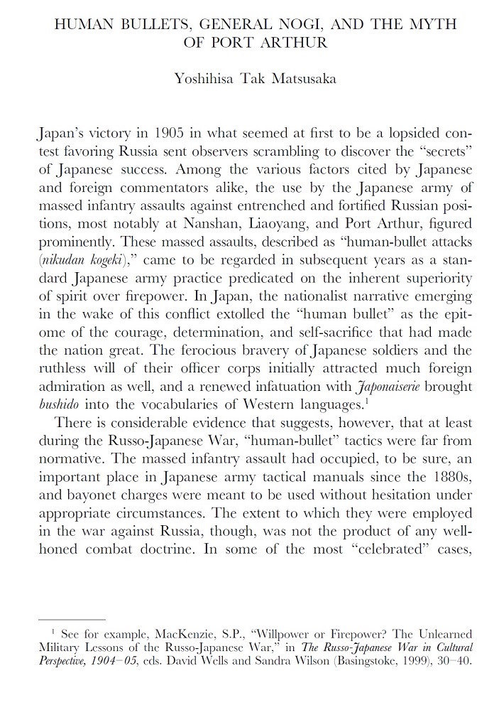 After the Russo–Japanese war (1904–05), Tadayoshi Sakurai (1879–1965), an army lieutenant, wrote a war literature Nikudan (Human Bullets): the record of the battle of Port Arther...