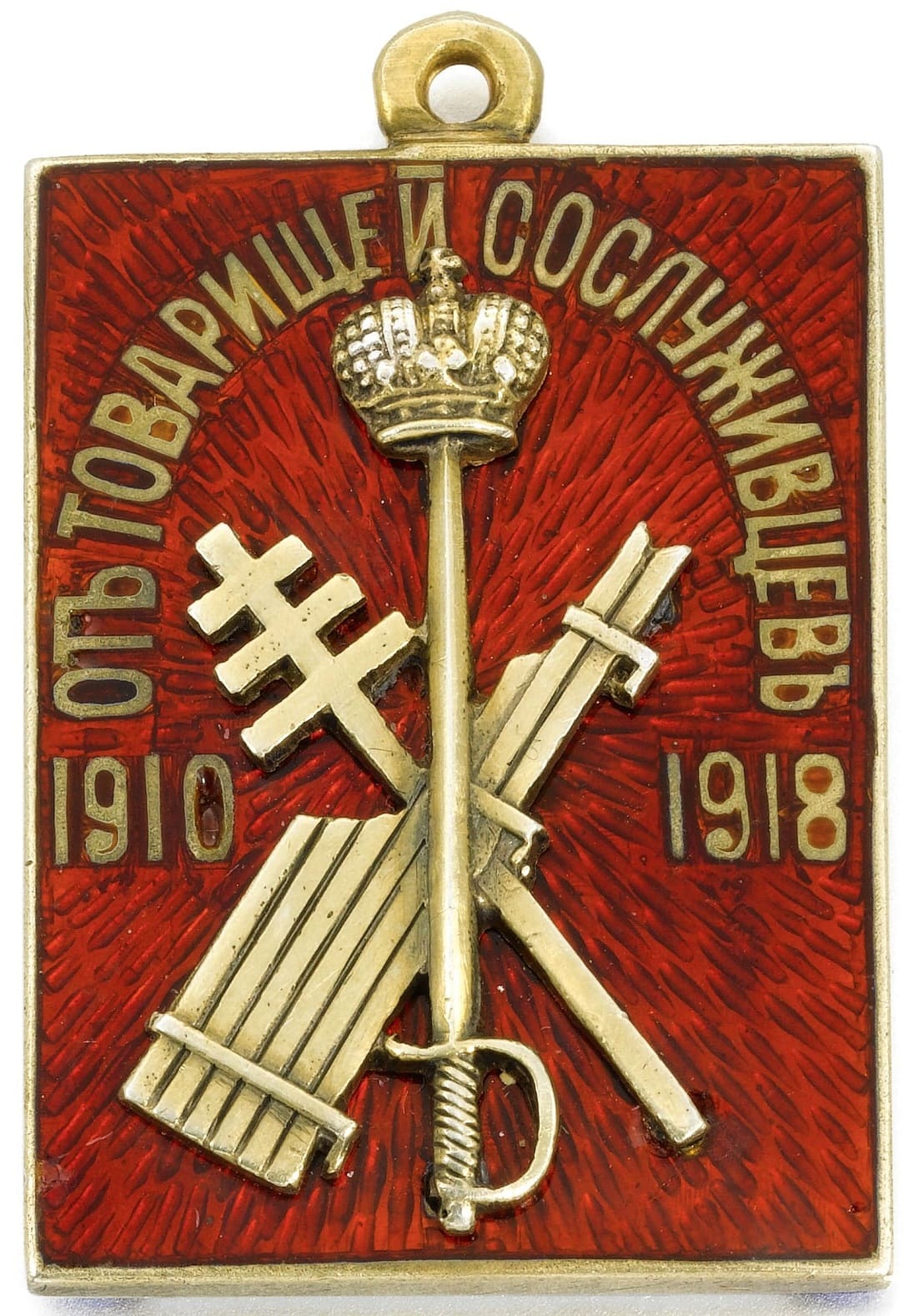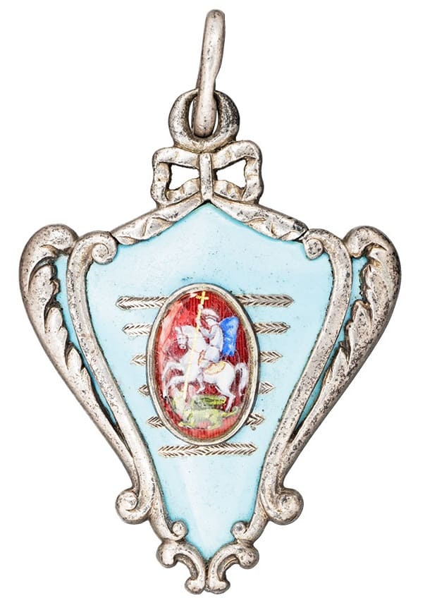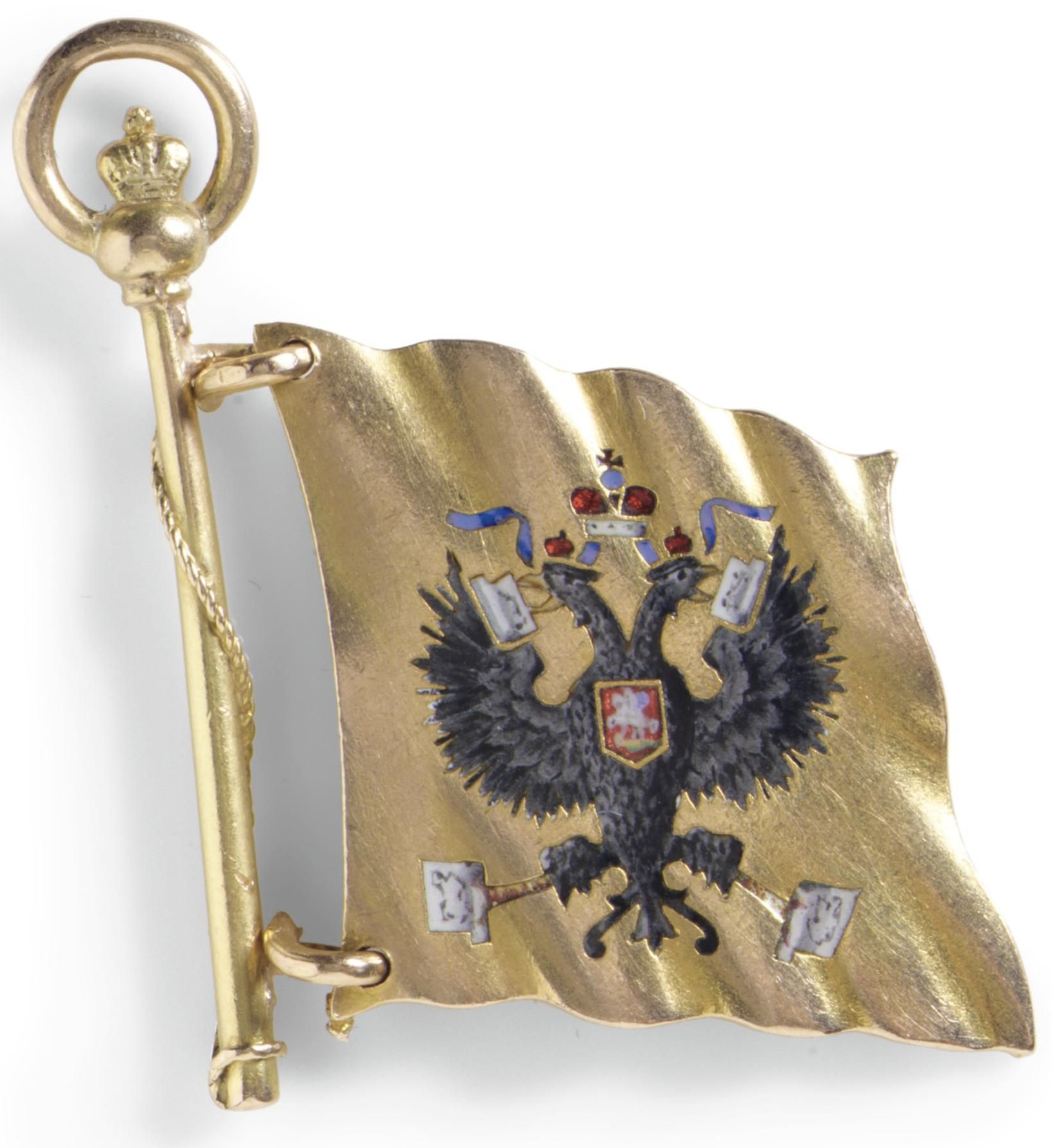 Enamelled with Imperial eagle, the reverse with the crowned Imperial monogram of the Dowager Empress Maria Feodorovna against red and white pennant of the Cavalry Guard Regiment, engraved 1906 below.