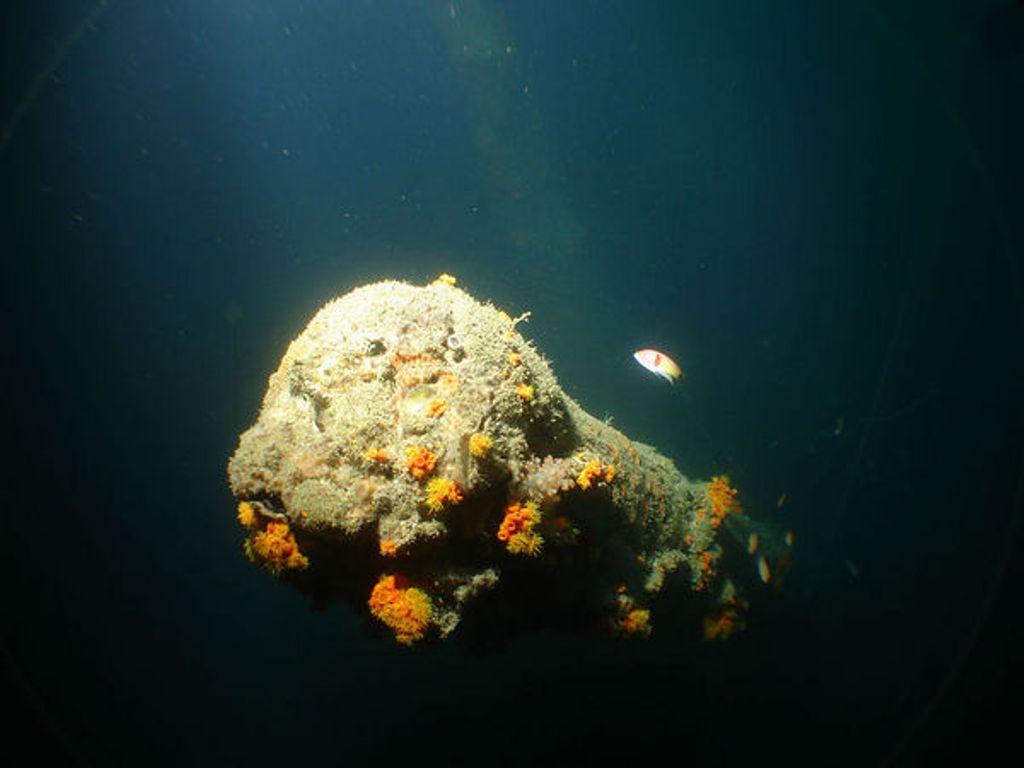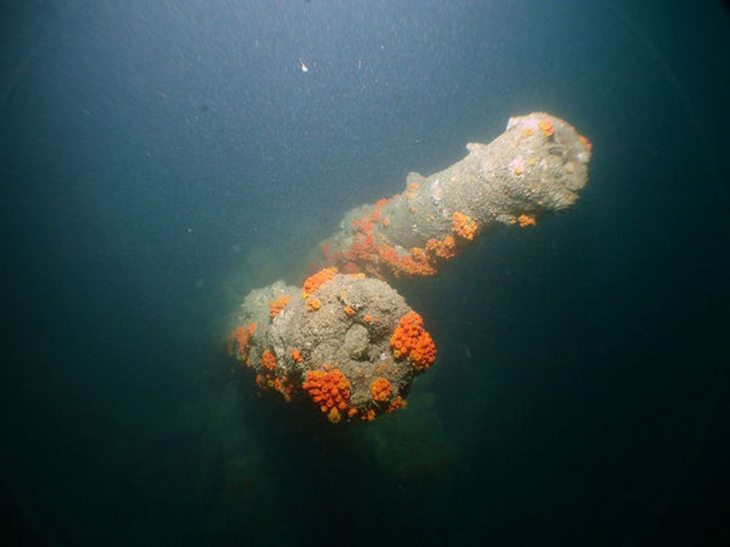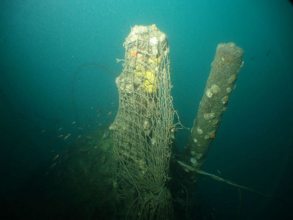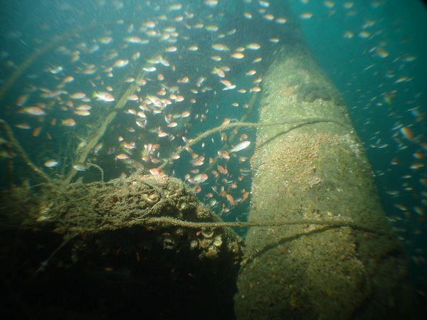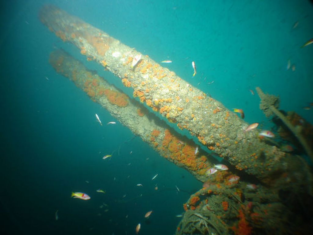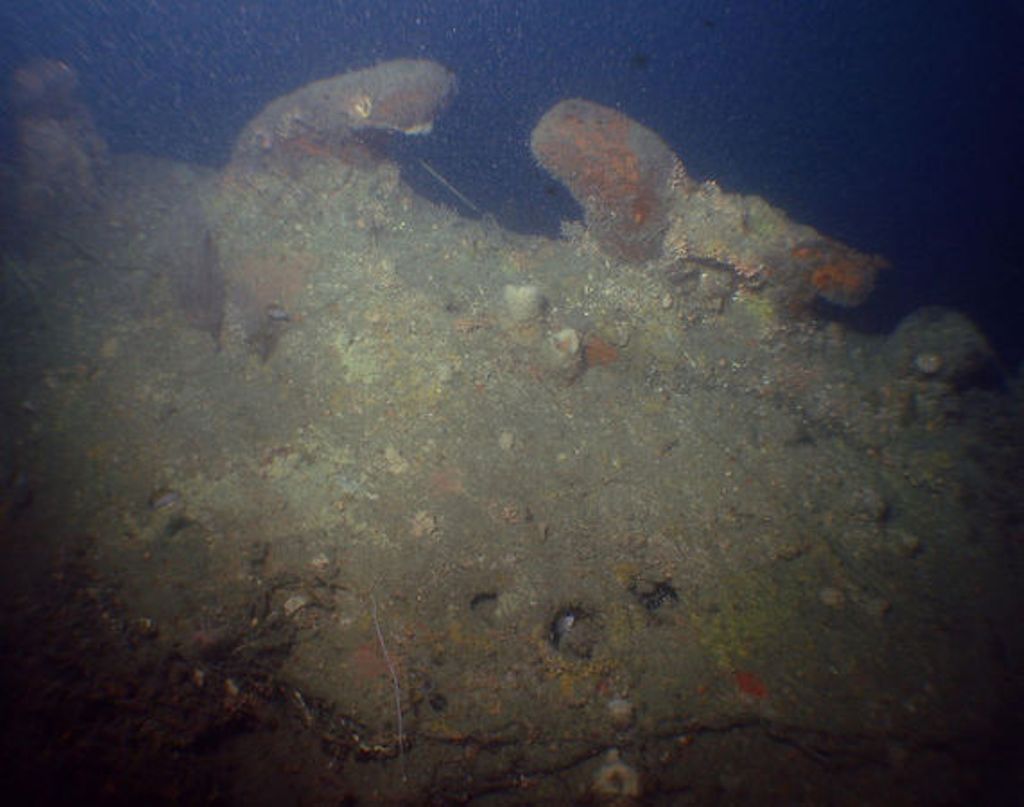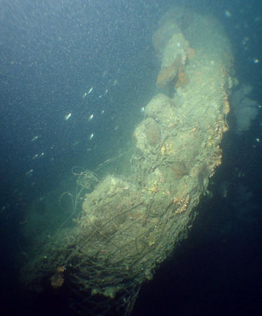 The wreck sits upright, covered in places by discarded trawler nets with her hull opposite her forward turrets buried in the seabed to about her original waterline, but this level gradually reduces until at the stern her outer propellers and shafts are actually up above the seabed. Her foremast and the top half of the bridge structure are missing/collapsed. Her mainmast is collapsed. Her funnels are missing. British hits are visible in places. The bow section forward of No. 2 turret is badly damaged by torpedo hits. Haguro's No. 1 turret and barbette are uprooted and lie against the hull, the rear of the turret on the starboard sea bed and the barrels pointing vertically towards the surface. Her No. 2 turret is trained to starboard at approximately the 1 o'clock position, with its roof collapsed and both barrels and breeches missing, as they were not replaced after being damaged by a bomb at the earlier Battle of Leyte Gulf. Her No. 3 turret's guns are askew and trained to the port quarter at the 8 o'clock position. Both her stern main turrets' guns point almost directly astern. Just behind the No. 5 turret, the wreck is broken in half, although the very stern section is still "partially" attached and heavily damaged on the port side.