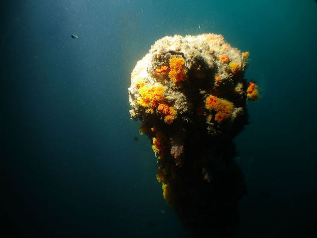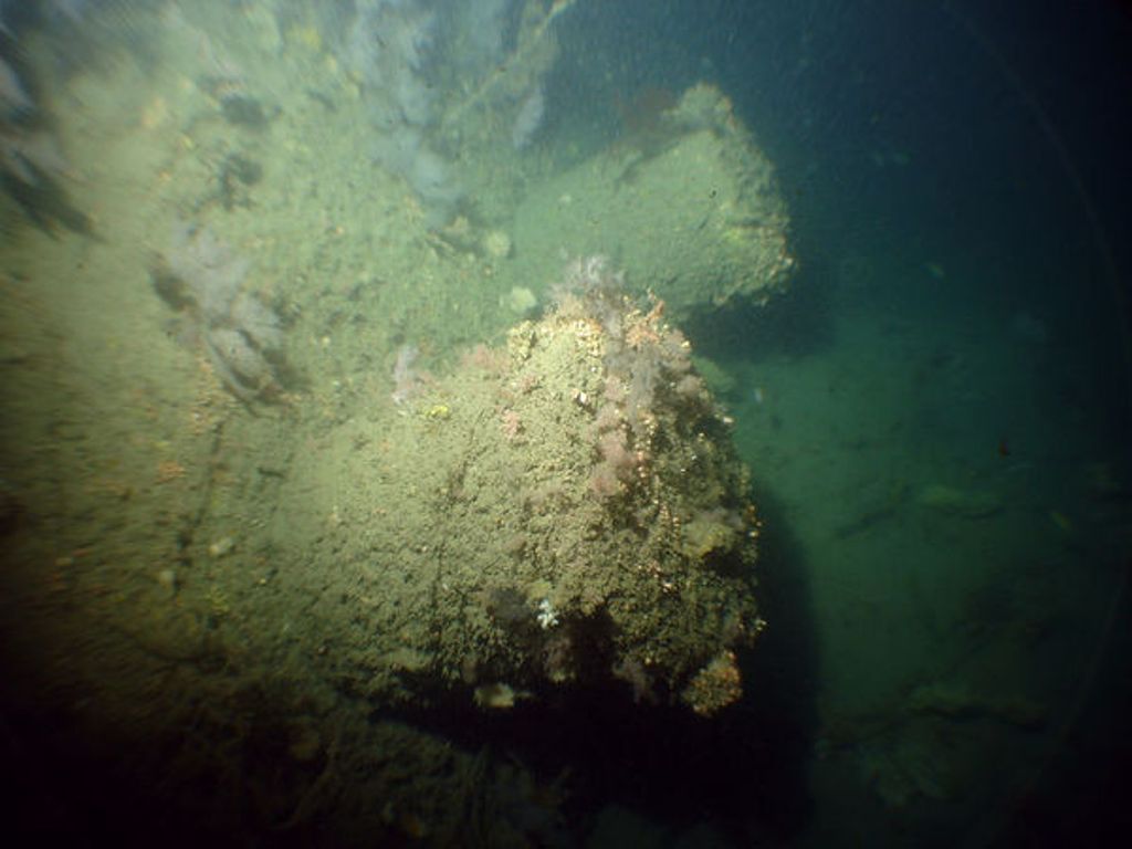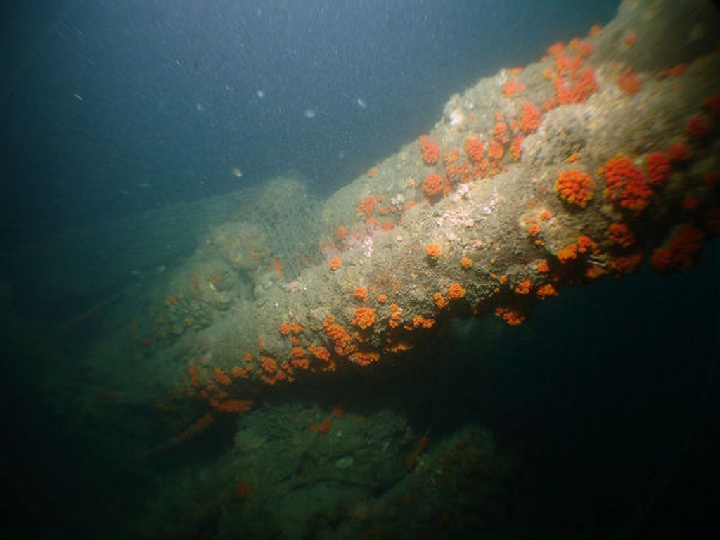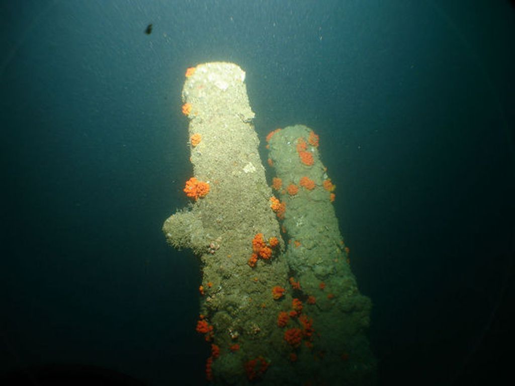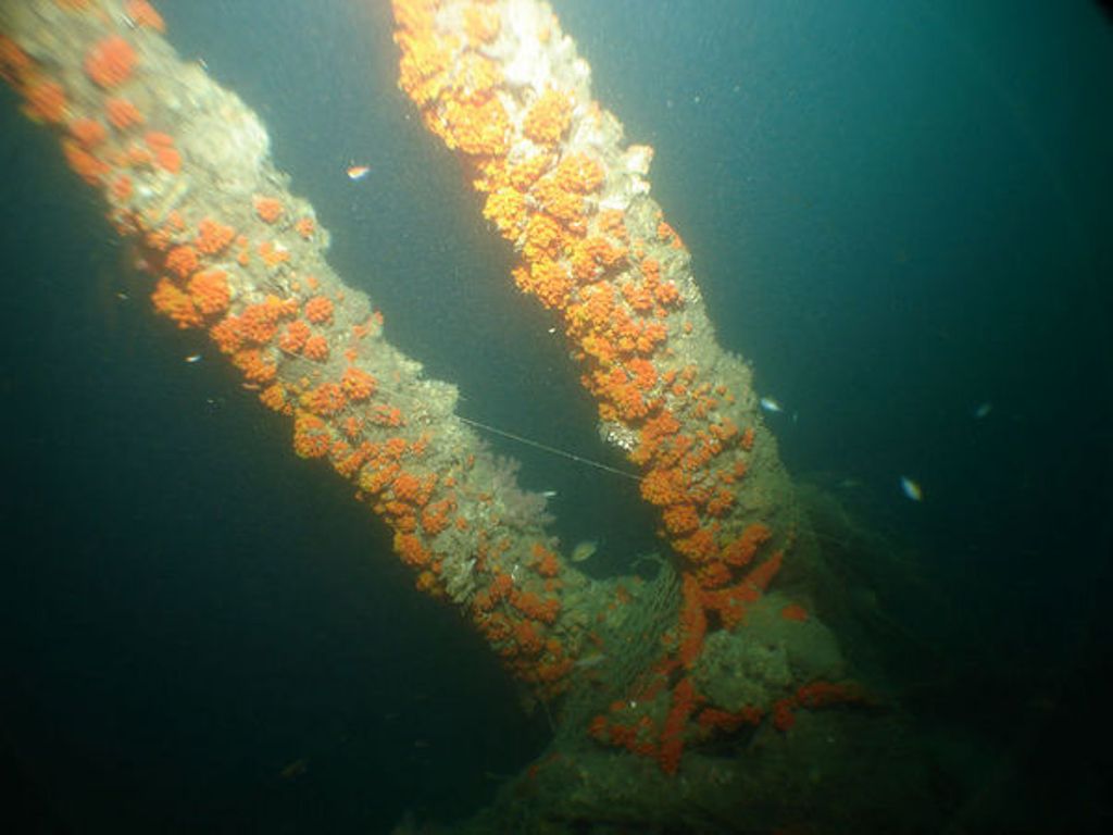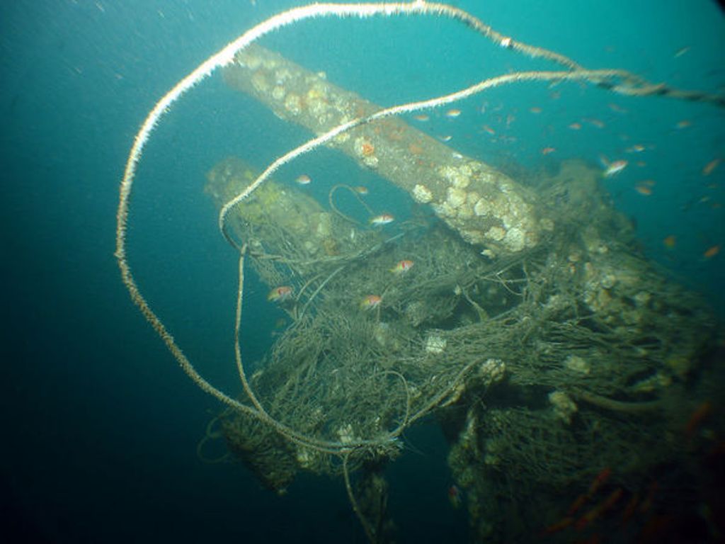 The wreck sits upright, covered in places by discarded trawler nets with her hull opposite her forward turrets buried in the seabed to about her original waterline, but this level gradually reduces until at the stern her outer propellers and shafts are actually up above the seabed. Her foremast and the top half of the bridge structure are missing/collapsed. Her mainmast is collapsed. Her funnels are missing. British hits are visible in places. The bow section forward of No. 2 turret is badly damaged by torpedo hits. Haguro's No. 1 turret and barbette are uprooted and lie against the hull, the rear of the turret on the starboard sea bed and the barrels pointing vertically towards the surface. Her No. 2 turret is trained to starboard at approximately the 1 o'clock position, with its roof collapsed and both barrels and breeches missing, as they were not replaced after being damaged by a bomb at the earlier Battle of Leyte Gulf. Her No. 3 turret's guns are askew and trained to the port quarter at the 8 o'clock position. Both her stern main turrets' guns point almost directly astern. Just behind the No. 5 turret, the wreck is broken in half, although the very stern section is still "partially" attached and heavily damaged on the port side.