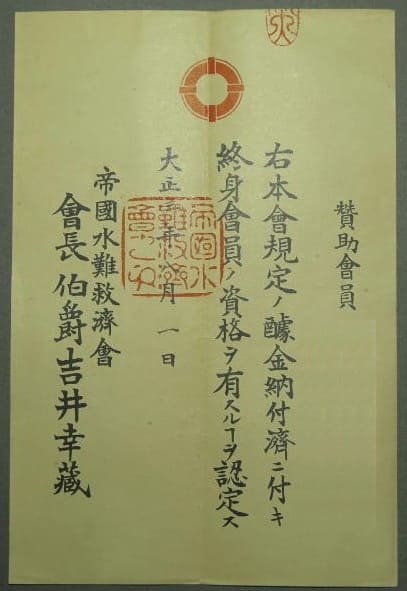 Japan Marine Rescue Association Membership Certificates/帝国水難救済会謝状賞状