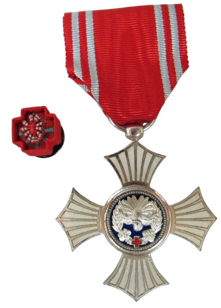 Design is borrowed from the Japanese Red Cross Society medals https://asiamedals.info/threads/official-chart-of-orders-of-merit-and-membership-medals-of-the-japanese-red-cross-society.24344/