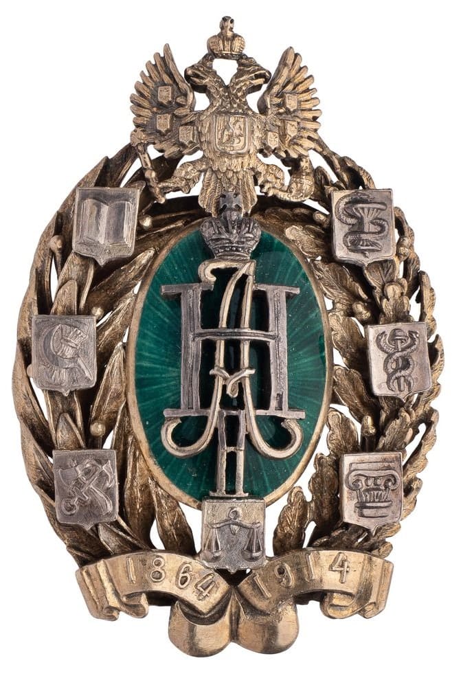 "In memory of the 50th anniversary of Zemstvo institutions" badge was established on January 3, 1914. The badge is an oval wreath of laurel and oak branches. The state coat of arms is superimposed on the top of the wreath. Inside the wreath there is an oval shield covered with radiant dark green...