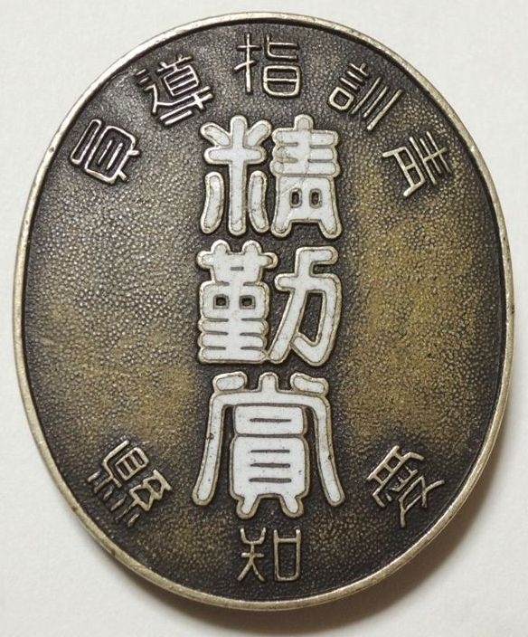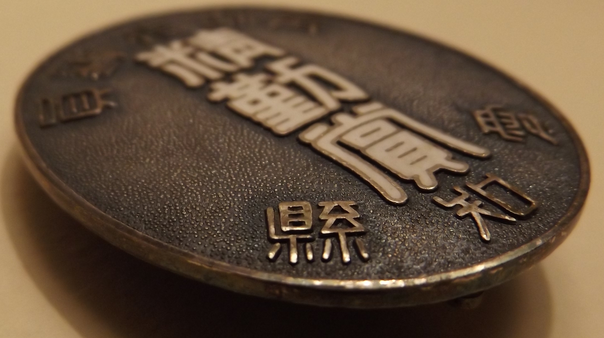 1st variation (marked "pure silver"). Specimen from personal collection. Obverse 青訓指導員 - Youth Training Instructor 精勤賞 - Diligence/Good Attendance Award 愛知県 - Aichi Prefecture Diamond cut kanji. Marked 純銀 - pure silver.